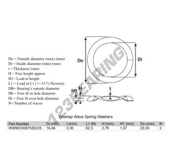 La Arandela Elástica Ondulada Superpuesta con la referencia WWMO008702623S tiene un diámetro interior de 16.46 mm y un espesor de 0.3 mm. Está fabricado con el material ACERO INOXIDABLE.