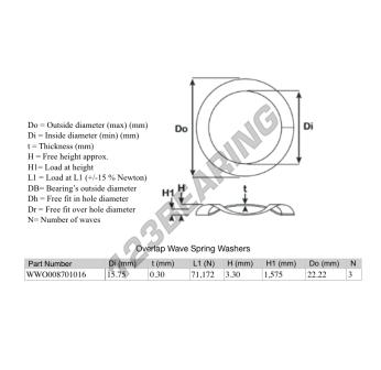 La Arandela Elástica Ondulada Superpuesta con la referencia WWO008701016 tiene un diámetro interior de 15.75 mm y un espesor de 0.3 mm. Está fabricado con el material ACERO.