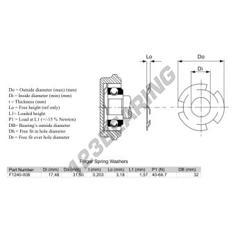 La Arandela Elástica De Orjeta con la referencia F1240-009 tiene un diámetro interior de 17.48 mm, un diámetro exterior de 31.5 mm y un espesor de 0.203 mm.
