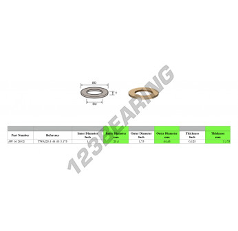 La Arandela De Rodamiento Axial conocida bajo la referencia TWAI25.4-44.45-3.175 Genérico mide 25.4 mm de diámetro interior, 44.45 mm de diámetro exterior y 3.175 mm de espesor.