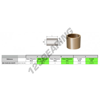 El Casquillo Bronce conocido por la referencia BAI19.05-25.4-53.975 Genérico tiene un diámetro interior de 19.05 mm, un diámetro exterior de 25.4 mm y una longitud de 53.975 mm. Está hecho de .