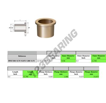 El Casquillo Bronce Con Collarín conocido por la referencia BFAI7.938-12.7-15.875-1.588-12.7 Genérico tiene un diámetro interior de 7.938 mm, un diámetro exterior de 12.7 mm y una longitud de 12.7 mm. Está hecho de .