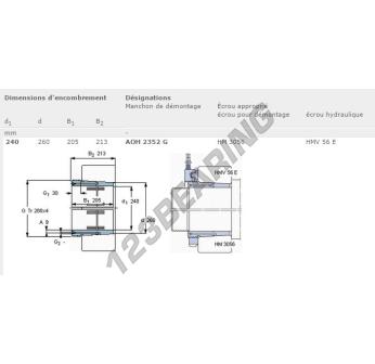 El Manguito, conocido como AOH2352G-SKF SKF, tiene un diámetro interior de 240 mm, un diámetro exterior de 260 mm y un espesor de 205 mm.