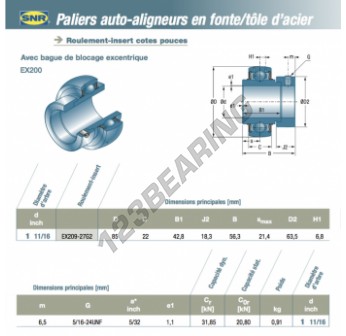 El Accesorio De Cojinete EX209-27-G2-SNR SNR mide 42.8625 mm de diámetro interior, 85 mm de diámetro exterior y 22 mm de espesor. Está fabricado en .
