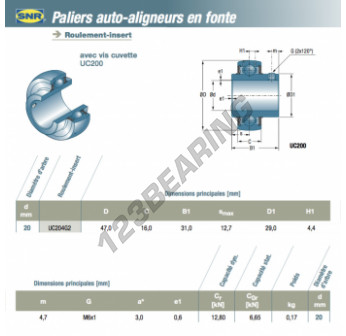 El Accesorio De Cojinete UC204-G2-SNR SNR mide 20 mm de diámetro interior, 47 mm de diámetro exterior y 16 mm de espesor. Está fabricado en .