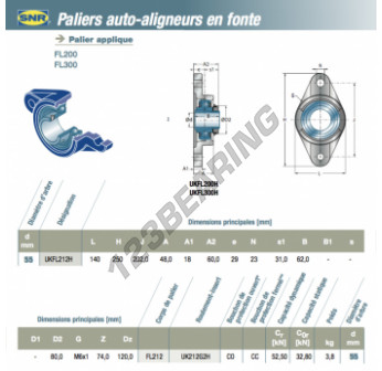 El Cojinete Hierro Fundido - 2 Fijaciones conocido como UKFL212H-SNR SNR tiene un diámetro de eje de 55 mm y un espaciamiento de fijación de 202 mm. Esta referencia se produce en hierro fundido y el tipo de fijación es .
