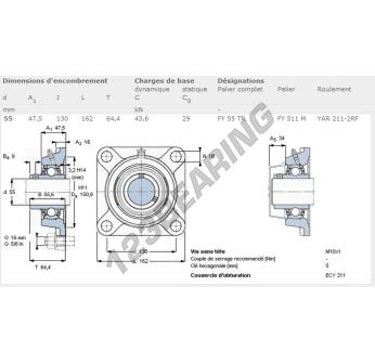 El Cojinete Hierro Fundido - 4 Fijaciones conocido como FY55-TR-SKF SKF tiene un diámetro de eje de 55 mm y un espaciamiento de fijación de 130 mm. Esta referencia se produce en hierro fundido y el tipo de fijación es .