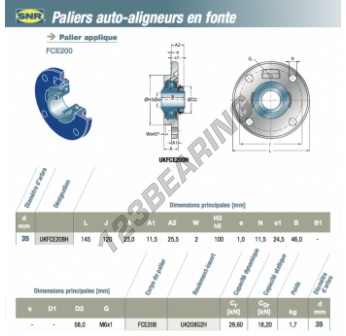 El Cojinete Hierro Fundido - 4 Fijaciones conocido como UKFCE208H-SNR SNR tiene un diámetro de eje de 35 mm y un espaciamiento de fijación de 120 mm. Esta referencia se produce en hierro fundido y el tipo de fijación es .