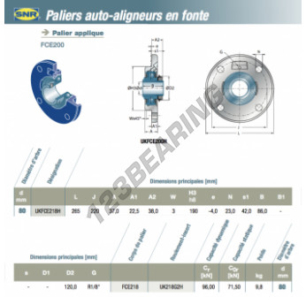 El Cojinete Hierro Fundido - 4 Fijaciones conocido como UKFCE218H-SNR SNR tiene un diámetro de eje de 80 mm y un espaciamiento de fijación de 220 mm. Esta referencia se produce en hierro fundido y el tipo de fijación es .