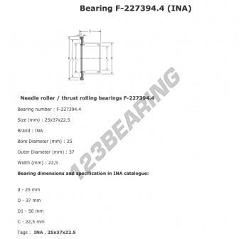 El Rodamiento De Agujas, conocido como F-227394.4-INA INA, tiene un diámetro interior de 25 mm, un diámetro exterior de 37 mm y un espesor de 22 mm.