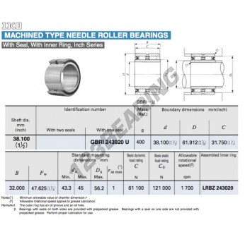 El Rodamiento De Agujas, conocido como GBRI243920-U-IKO IKO, tiene un diámetro interior de 38.1 mm, un diámetro exterior de 61.912 mm y un espesor de 31.75 mm.
