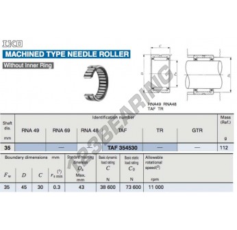 El Rodamiento De Agujas, conocido como TAF354530-IKO IKO, tiene un diámetro interior de 35 mm, un diámetro exterior de 45 mm y un espesor de 30 mm.