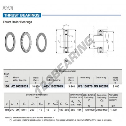 El Rodamiento Axial De Agujas, conocido como AZ16027039-IKO IKO, tiene un diámetro interior de 160 mm, un diámetro exterior de 270 mm y un espesor de 39 mm.
