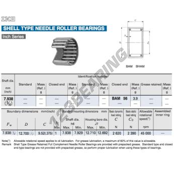 El Buje De Agujas, conocido como BAM56-IKO IKO, tiene un diámetro interior de 7.94 mm, un diámetro exterior de 12.7 mm y un espesor de 9.52 mm.