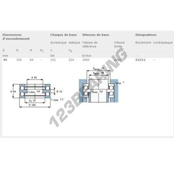 El Rodamiento Axial De Bollas, conocido como 52311-SKF SKF, tiene un diámetro interior de 45 mm, un diámetro exterior de 105 mm y un espesor de 64 mm.
