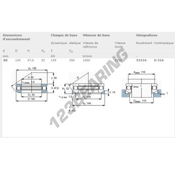 El Rodamiento Axial De Bollas, conocido como 53316-SKF SKF, tiene un diámetro interior de 80 mm, un diámetro exterior de 140 mm y un espesor de 52 mm.