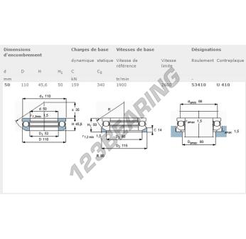 El Rodamiento Axial De Bollas, conocido como 53410-SKF SKF, tiene un diámetro interior de 50 mm, un diámetro exterior de 110 mm y un espesor de 45.6 mm.
