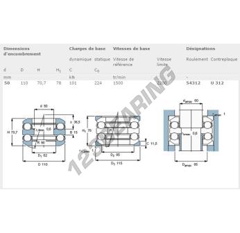El Rodamiento Axial De Bollas, conocido como 54312-SKF SKF, tiene un diámetro interior de 50 mm, un diámetro exterior de 110 mm y un espesor de 70.7 mm.