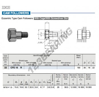 El Seguidor De Leva, conocido como CFE16-R-IKO IKO, tiene un diámetro interior de 22 mm, un diámetro exterior de 35 mm y un espesor de 18 mm.
