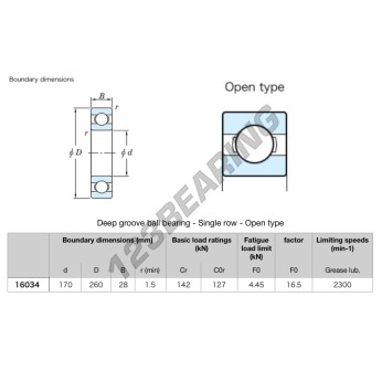 El Rodamiento De Bolas, conocido como 16034-JTEKT JTEKT, tiene un diámetro interior de 170 mm, un diámetro exterior de 260 mm y un espesor de 28 mm.