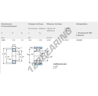El Rodamiento De Bolas, conocido como 16040-SKF SKF, tiene un diámetro interior de 200 mm, un diámetro exterior de 310 mm y un espesor de 34 mm.