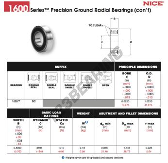 El Rodamiento De Bolas, conocido como 1628-DC-NICE NICE, tiene un diámetro interior de 15.875 mm, un diámetro exterior de 41.275 mm y un espesor de 12.7 mm.