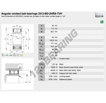 El Rodamiento De Bolas, conocido como 3212-BD-2HRS-TVH-FAG FAG, tiene un diámetro interior de 60 mm, un diámetro exterior de 110 mm y un espesor de 36.5 mm.