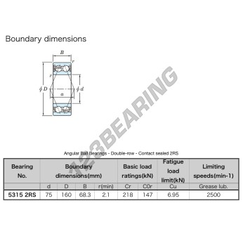 El Rodamiento De Bolas, conocido como 5315-2RS-JTEKT JTEKT, tiene un diámetro interior de 75 mm, un diámetro exterior de 160 mm y un espesor de 68.3 mm.