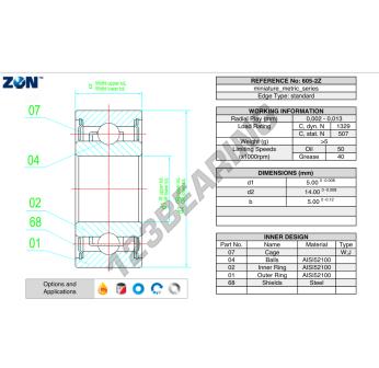 El Rodamiento De Bolas, conocido como 605-2Z-ZEN ZEN, tiene un diámetro interior de 5 mm, un diámetro exterior de 14 mm y un espesor de 5 mm.