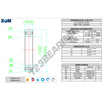 El Rodamiento De Bolas, conocido como 61815-ZZ-ZEN ZEN, tiene un diámetro interior de 75 mm, un diámetro exterior de 95 mm y un espesor de 10 mm.