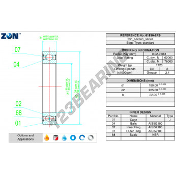 El Rodamiento De Bolas, conocido como 61836-2RS-ZEN ZEN, tiene un diámetro interior de 180 mm, un diámetro exterior de 225 mm y un espesor de 22 mm.