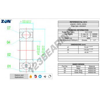 El Rodamiento De Bolas, conocido como 6414-ZEN ZEN, tiene un diámetro interior de 70 mm, un diámetro exterior de 180 mm y un espesor de 42 mm.