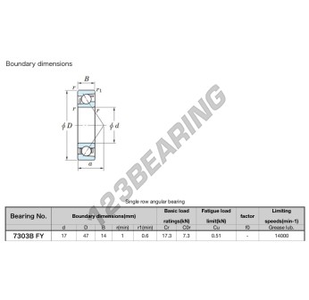 El Rodamiento De Bolas, conocido como 7303-B-FY-JTEKT JTEKT, tiene un diámetro interior de 17 mm, un diámetro exterior de 47 mm y un espesor de 14 mm.