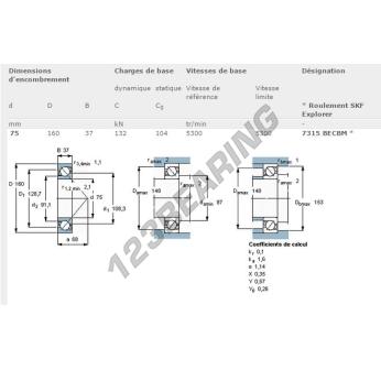 El Rodamiento De Bolas, conocido como 7315-BECBM-SKF SKF, tiene un diámetro interior de 75 mm, un diámetro exterior de 160 mm y un espesor de 37 mm.