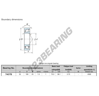 El Rodamiento De Bolas, conocido como 7407-B-JTEKT JTEKT, tiene un diámetro interior de 35 mm, un diámetro exterior de 100 mm y un espesor de 25 mm.