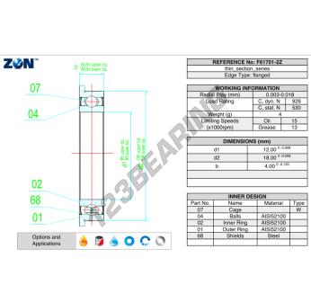 El Rodamiento De Bolas, conocido como F61701-ZZ-ZEN ZEN, tiene un diámetro interior de 12 mm, un diámetro exterior de 18 mm y un espesor de 4 mm.