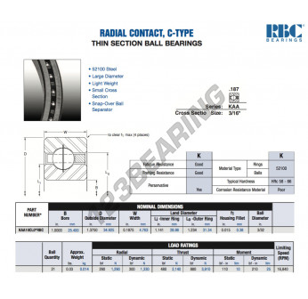El Rodamiento De Bolas, conocido como KAA10-CL0-RBC RBC, tiene un diámetro interior de 25.4 mm, un diámetro exterior de 34.925 mm y un espesor de 4.763 mm.