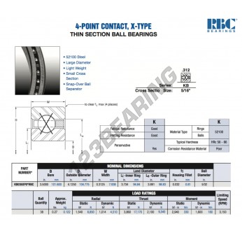 El Rodamiento De Bolas, conocido como KB035-XP0-RBC RBC, tiene un diámetro interior de 101.6 mm, un diámetro exterior de 104.775 mm y un espesor de 7.938 mm.