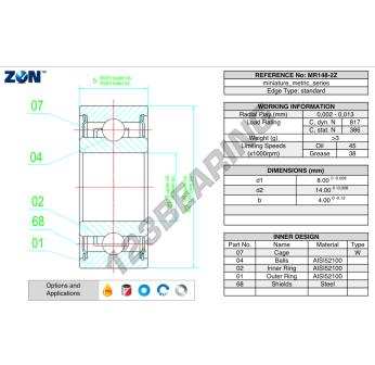 El Rodamiento De Bolas, conocido como MR148-2Z-ZEN ZEN, tiene un diámetro interior de 8 mm, un diámetro exterior de 14 mm y un espesor de 4 mm.