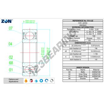 El Rodamiento De Bolas, conocido como R14-2Z-ZEN ZEN, tiene un diámetro interior de 22.2 mm, un diámetro exterior de 47.6 mm y un espesor de 12.7 mm.