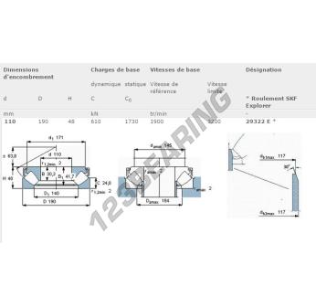 El Rodamiento Axial De Rodillos, conocido como 29322-E-SKF SKF, tiene un diámetro interior de 110 mm, un diámetro exterior de 190 mm y un espesor de 48 mm.
