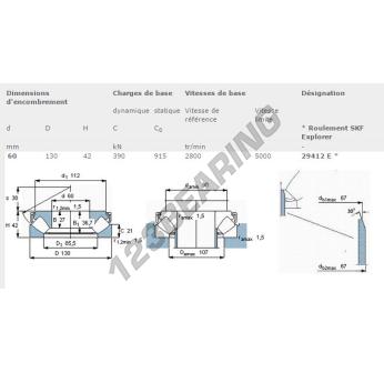 El Rodamiento Axial De Rodillos, conocido como 29412-E-SKF SKF, tiene un diámetro interior de 60 mm, un diámetro exterior de 130 mm y un espesor de 42 mm.
