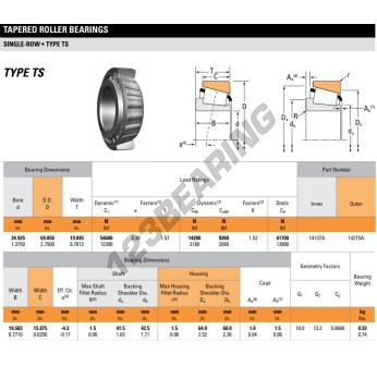 El Rodamiento Cónico, conocido como 14137A-14275A-TIMKEN TIMKEN, tiene un diámetro interior de 34.93 mm, un diámetro exterior de 69.85 mm y un espesor de 19.85 mm.
