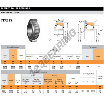 El Rodamiento Cónico, conocido como 2788A-2736-TIMKEN TIMKEN, tiene un diámetro interior de 38.1 mm, un diámetro exterior de 74.612 mm y un espesor de 23.812 mm.