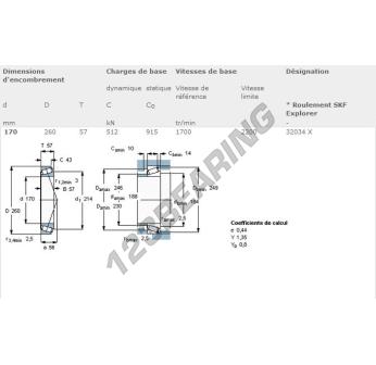 El Rodamiento Cónico, conocido como 32034X-SKF SKF, tiene un diámetro interior de 170 mm, un diámetro exterior de 260 mm y un espesor de 57 mm.