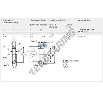 El Rodamiento Cónico, conocido como 32044X-SKF SKF, tiene un diámetro interior de 220 mm, un diámetro exterior de 340 mm y un espesor de 76 mm.