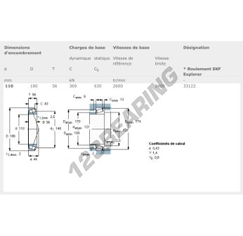 El Rodamiento Cónico, conocido como 33122-SKF SKF, tiene un diámetro interior de 110 mm, un diámetro exterior de 180 mm y un espesor de 56 mm.