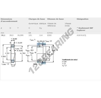 El Rodamiento Cónico, conocido como 418-414-Q-SKF SKF, tiene un diámetro interior de 38.1 mm, un diámetro exterior de 88.5 mm y un espesor de 26.99 mm.