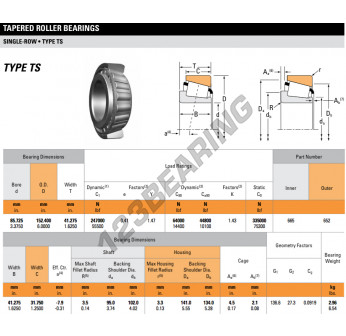 El Rodamiento Cónico, conocido como 665-652-TIMKEN TIMKEN, tiene un diámetro interior de 85.725 mm, un diámetro exterior de 152.4 mm y un espesor de 41.275 mm.