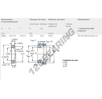 El Rodamiento Cónico, conocido como HM807046-HM804010-QCL7C-SKF SKF, tiene un diámetro interior de 50.8 mm, un diámetro exterior de 104.78 mm y un espesor de 36.51 mm.